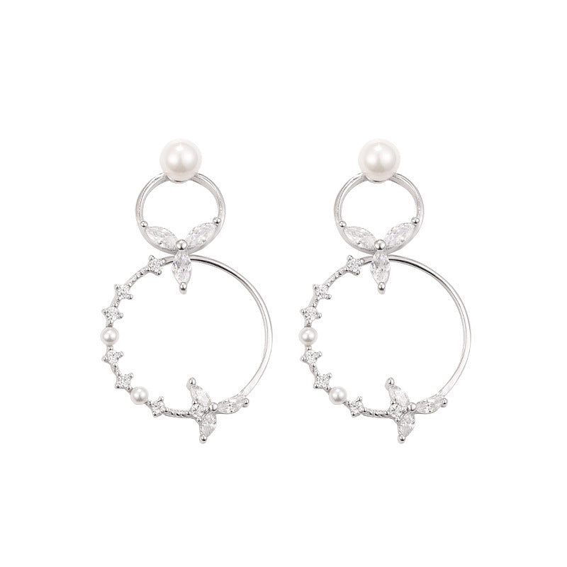 New 925 Sterling Silver Double Circle Pearl Drop Earrings For Women Fashion Elegant Gold Mosaic Zircon Earing Fashion Jewelry